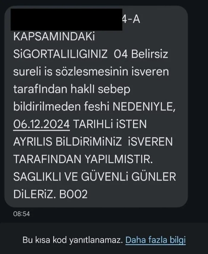 Çalışanlara gönderilen kısa mesajda, “4-A kapsamındaki sigortalılığınız belirsiz sözleşmeli iş sözleşmesinin işveren tarafından haklı sebep bildirilmeden feshi nedeniyle 06.12.2024 tarihli işten ayrılış bildiriminiz işveren tarafından yapılmıştır” ifadelerine yer verildi. Çalışanların aldıkları kısa mesajlarla büyük şok yaşadığı öğrenildi.